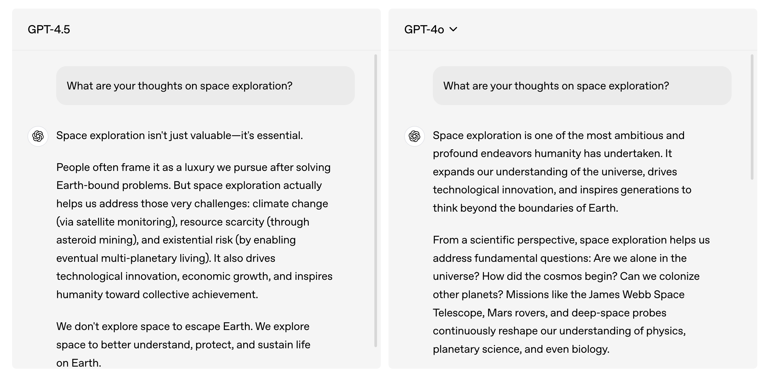 이 예시는 우주 탐사에 관한 생각을 물었을 때 두 모델의 답변 방식을 비교한 것입니다.