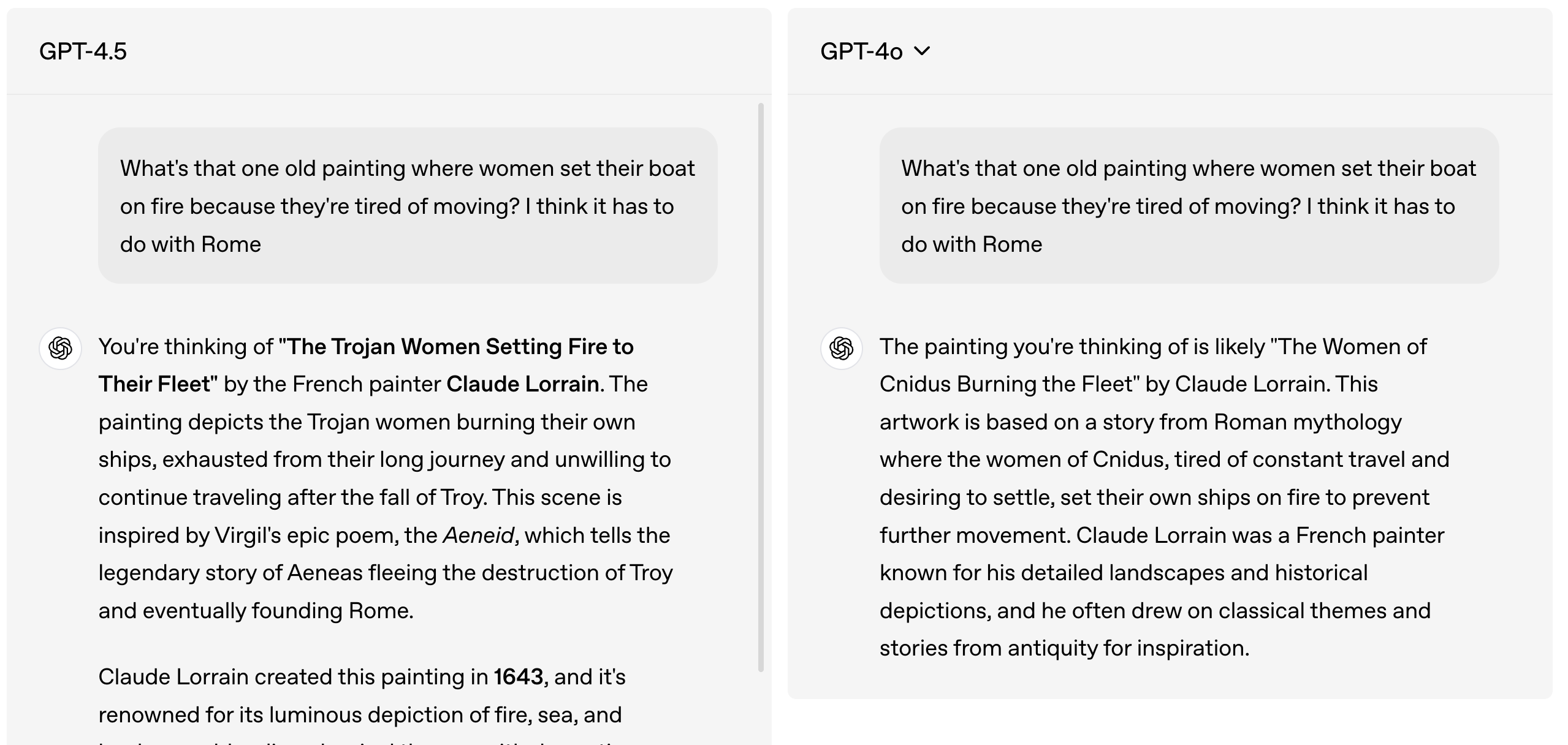 이를 통해 GPT-4.5가 작품 식별 및 정확한 정보 제공에 있어 GPT-4o보다 훨씬 뛰어나다는 점을 확인할 수 있습니다.