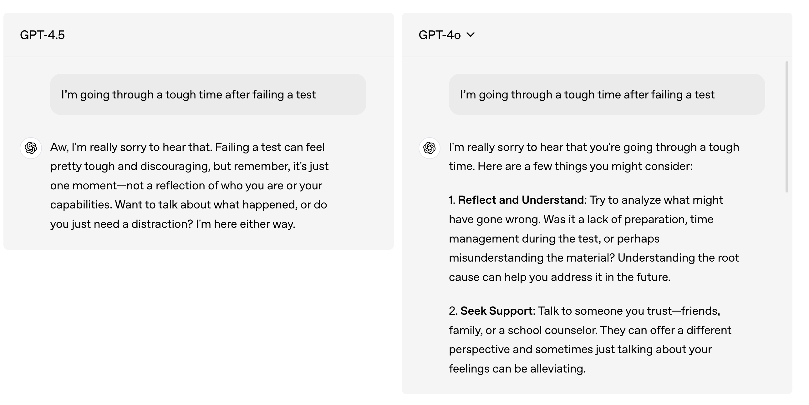 GPT-4.5의 또 다른 중요한 발전은 높은 수준의 감성 지능(Emotional Intelligence, EQ) 입니다. 이는 AI가 인간의 감정과 상황을 이해하고, 공감하며 대응하는 능력을 말합니다. 예를 들어, 시험 실패로 인해 어려움을 겪는 사용자에게 즉각적이고 따뜻한 위로를 제공해, 사용자에게 감성적 안정감을 줍니다. 기존 모델 GPT-4o가 주로 논리적이고 길게 설명하는 것과 달리, GPT-4.5는 인간의 감정 상태를 빠르게 이해하고, 간결하고 자연스러운 소통으로 사용자와의 친밀감을 높입니다.